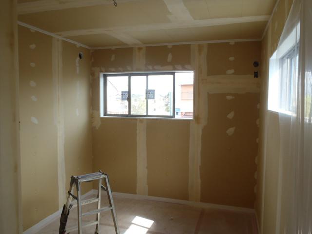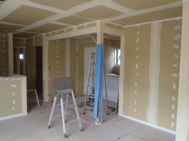 ・外部足場が解体され建物全景を確認できるようになりました。 外部工事・給排水埋設管設置、基礎幅木塗り進めて行きます。 ・内装仕上げ工事へと入りました。壁・天井ボード下地処理し クロス下地パテ入れを行っています。パテ下地乾き次第 天井よりクロス貼りを行っていきます。
