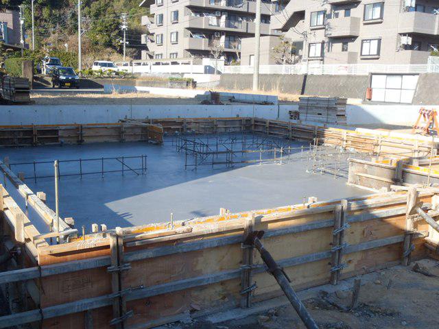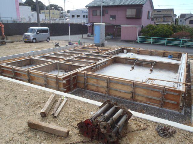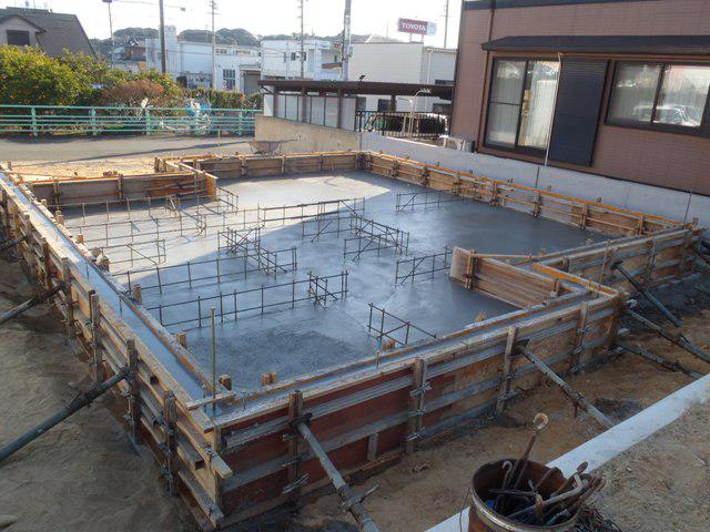 ★先週の工事★ 基礎工事(ベースコンクリート部コンクリート打ち、 内部布基礎部型枠組み、コンクリート養生、他) ★今週の予定工事★ 基礎工事(コンクリート養生、型枠材解体、基礎廻り 排水先行配管、埋戻し・整地、他)
