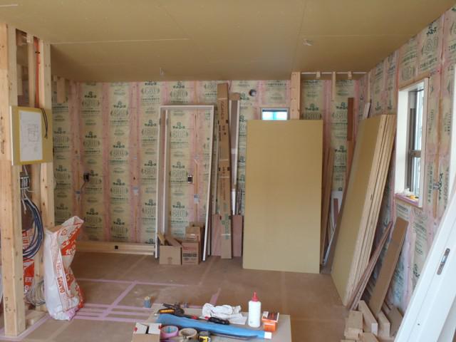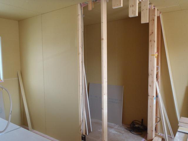 ★先週の工事★ 木工事(壁下地合板・プラスターボード貼り、ドア開口枠 組立取付、他) 外壁工事(サイディング貼り、コーキング打ち、他)