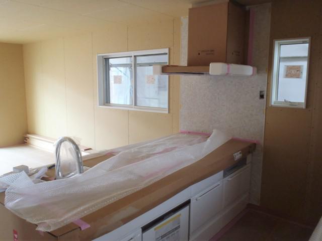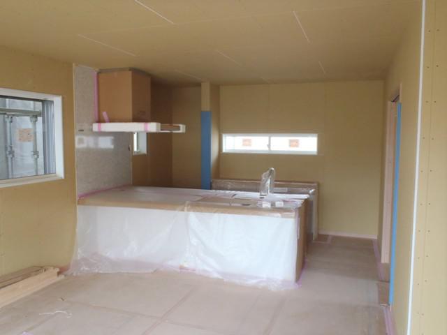 ・外部点検し外部足場解体しました。外部給排水・エコキュート 据付準備へと進めます。 ・キッチン据付設置しLDK生活空間の間隔などが確認できる ようになりました。 ・内部木工事幅木取付、建具吊り込みを行い完了となります。