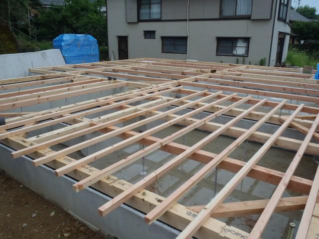 ・基礎工事、玄関・ポーチタイル下地コンクリート打ち、 基礎廻り埋め戻し整地し完了いたしました。 ・土台、床下地材が搬入され、土台据え、床下地組みを 進めています。柱・梁・構造材下地木材等搬入、外部足場 組み上、上棟準備を進め上棟を迎えます。