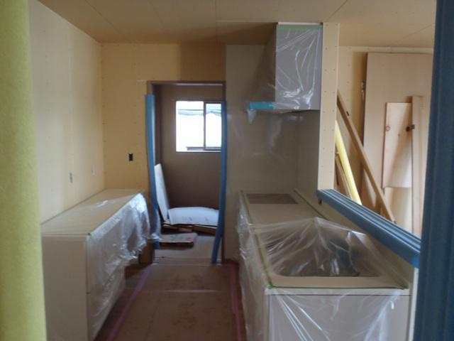 貼りが完了し幅木取付、建具吊り込み進めています。