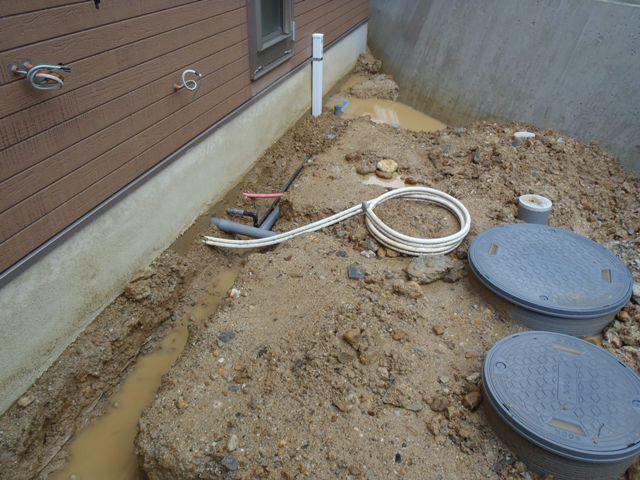 ・外部工事、給排水埋設、雨水放流接続、エコキュート配管を進めて います。内部内装仕上げクロス貼り・クッションシート貼りを 終え、電気スイッチ・コンセントプレート配電盤納め、衛生 器具付けへと入っていきます。