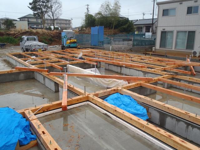 ・土台下地木材が搬入され土台据え、床下地組みを行い上棟