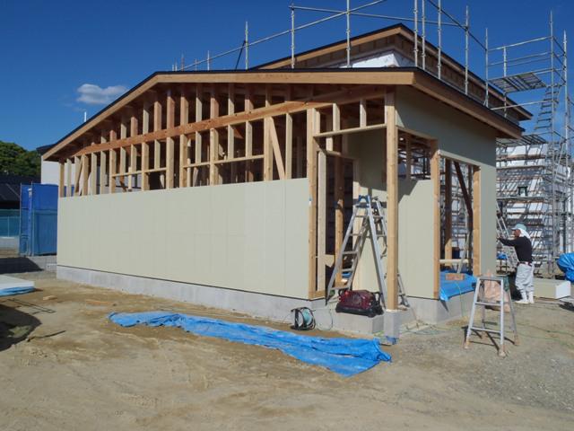 ★先週の工事★ 木工事(筋違・間柱入れ、構造金物取付、サッシ開口造作 天井下地組み、外壁下地ボード貼り、他) 外部足場組み 防腐防蟻処理 構造検査 屋根工事(ガルバリウム鋼板葺き、棟納め板金、他) 電気内部配管・配線