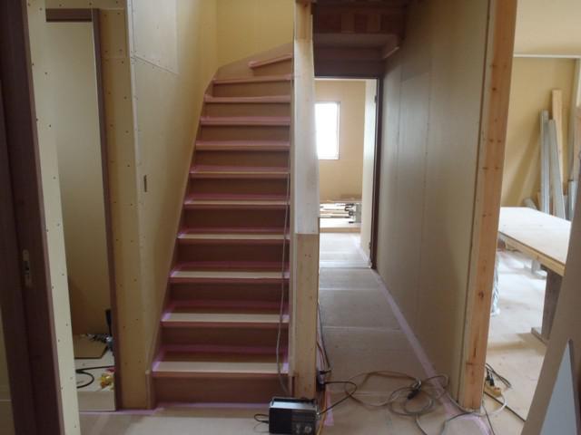 ・内部木工事 階段造作および階段養生を行い、2階への昇降が