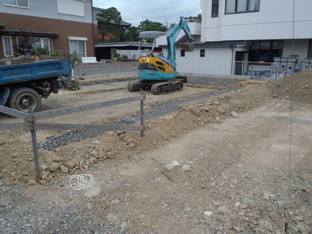 ・基礎工事へ着手しました、基礎高さ基準となる(丁張)を 行い、掘削、砕石地業を進めています。 ・砕石敷き後、土間シート敷き、ベース型枠組み、鉄筋加工・ 鉄筋組みへと順次行ってきます。