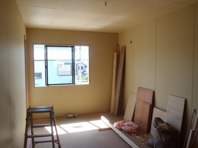 ・内部木工事、先週より引き続き2階壁断熱材入れ、壁ボード 貼りが進み各部屋が間仕切られてきました。 ・ドア枠取付取付、枠取り合いボード納め、固定棚類取付、 幅木取付へと進めます。