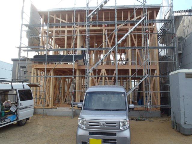 ・木工事、下屋根下地・防水紙葺き、構造金物取付を終え