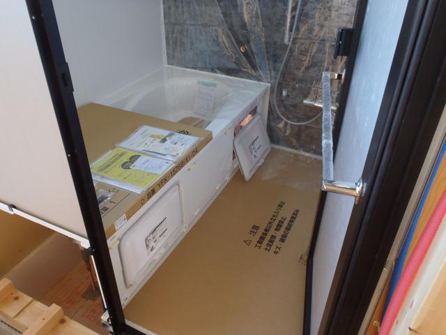 ・15日ユニットバス据付設置しました。浴槽エプロン部取付て ありませんが、給水・給湯、追い焚き管、通水試験(仕上げ 工事時)後に設置します。 ・木工事2階天井を納め、1階天井下地組み及びボード貼り、外壁 材下地木材打ちへと進めています。