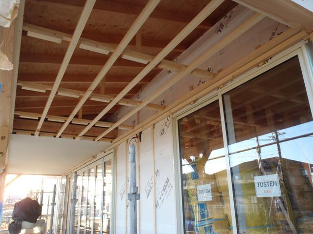 外壁下地材打ち、内部造作、天井下地組み及び天井ボード