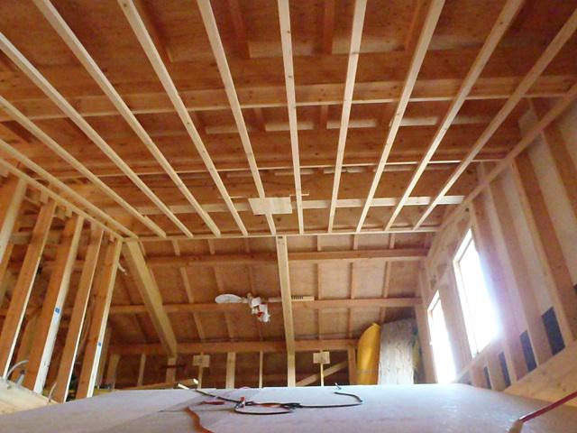 ・木工事、軒天ボード残貼り、吹抜け天井下地組みボード貼りに
