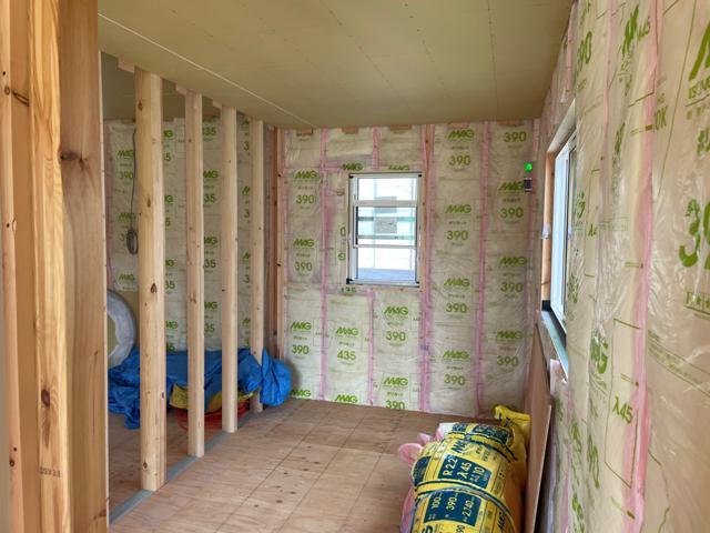 ・外壁ラップサイディング張り防水処理コーキング打ちを 完了しました。 ・内部木工事、軒天ボード残貼り、壁下地打ち、壁断熱材入れを 終え、床フローリング貼りに取り掛かります。