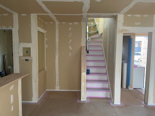 ・内部木工事、固定棚類取付、建具吊り込み、可動棚加工と 行い、木工事完了となりました。 ・上棟準備より鈴木棟梁にて木工事まとめて頂き、内装仕上げ 工事へと進めて行きます。 ・クロス下地調整、クロスパテ入れを行っています。 パテ乾き次第クロス貼りを予定しています。