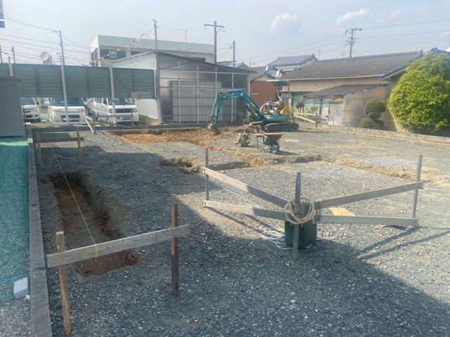 ・基礎工事へ着手しました。基礎高さ基準となる(丁張)を 行い、掘削作業行っています。 ・砕石地業、土間シート敷き、ベース型枠組み、鉄筋加工及び 鉄筋組みを進めます。