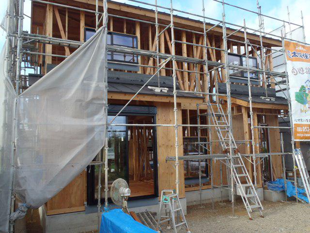 ・木工事、間柱を入れ構造金物を取付、耐震ダンバー設置 防腐・防蟻処理を行い保証機構JIO及び検査機構による中間 検査(建物の骨組み、使用構造金物の確認)を受け、次工程、 外壁下地シート貼り、外壁下地材取付を行います。