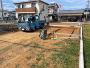 ・基礎工事へ着手しました、基礎高さ基準となる(丁張)を 行い掘削作業進めています。 ・砕石地業、土間シート敷き、ベース型枠組み、鉄筋加工・ 鉄筋組みを予定しています。