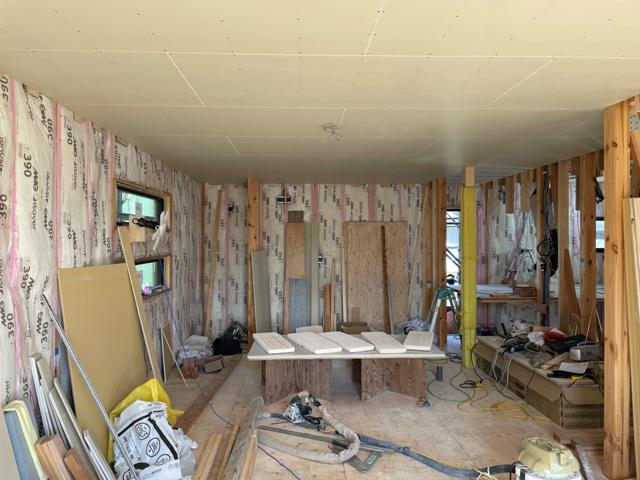 木工事(1階天井下地組み及び天井ボード貼り、断熱材入れ