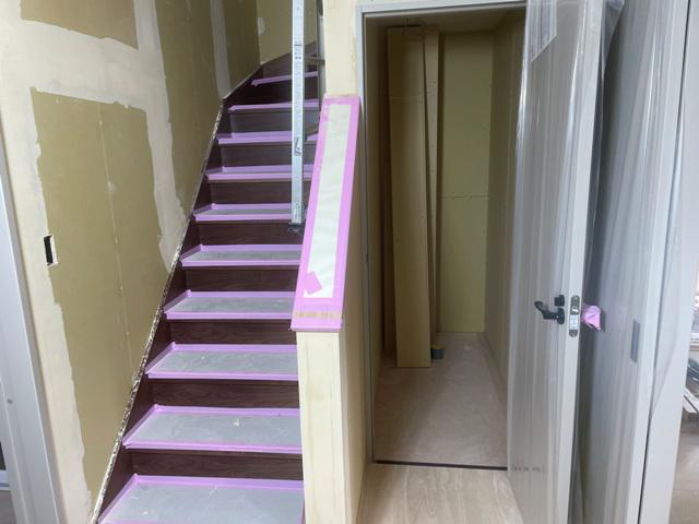 ・木工事、納材された部材より取付加工へと入っています、 内装仕上げ工事に取り掛かり 2階よりクロス下地、クロスパテ入れ 進めています。 天井・壁ボードのジョイント部・壁出隅部や ビス頭 パテ処理を行い下地処理後、クロス貼りに入ります。