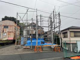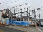 ・床下地組み、上棟準備、柱・梁、下地木材搬入し、外部足場 組みを終え上棟を迎えます、上棟当日は1・2階構造材組み、 小屋組、屋根下地と予定しています、建物高さ、間取り間隔 等の確認を行えます。