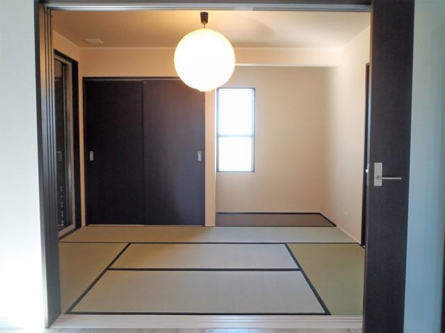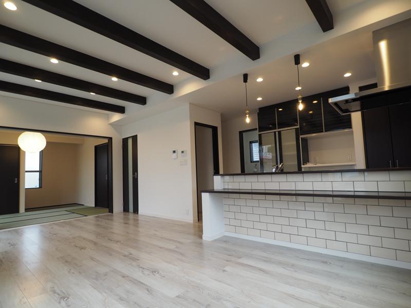 LDKの梁がアクセントになり空間が 引き立ちます。 明るく開放的なLDKは家族団らんのスペースには大切ですよね♪ LDKの隣には、個室にも続き間にもなる6帖の和室を設けました。お施主様がこだわったお洒落な照明も素敵です。