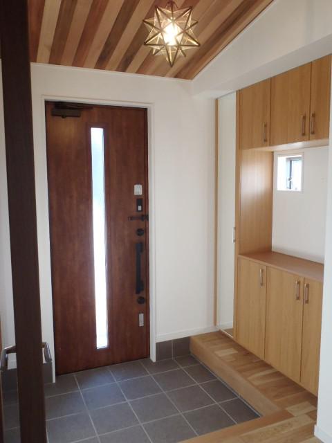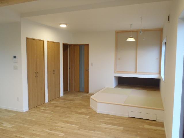 2018.11.14完成 玄関は勾配天井なので広々とした 空間に仕上がりました♪ オシャレな照明もアクセントに ぴったりですね。 LDKには小上がりの畳コーナーを設けました! 収納もあり機能性にも優れた造りになっています♪