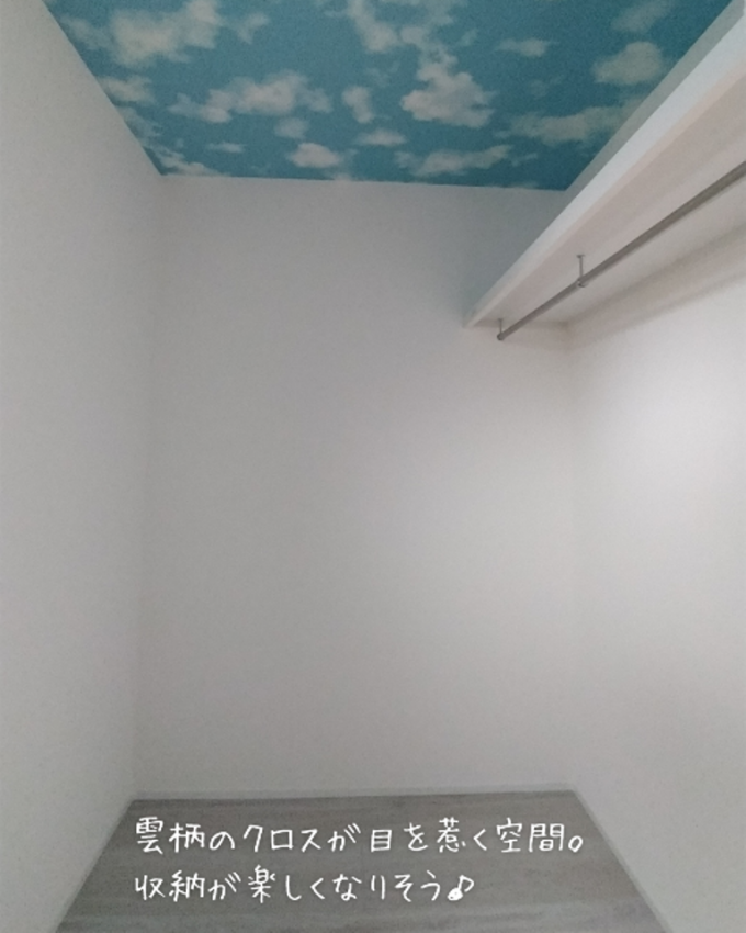 収納には、天井に雲柄の壁紙を使い、